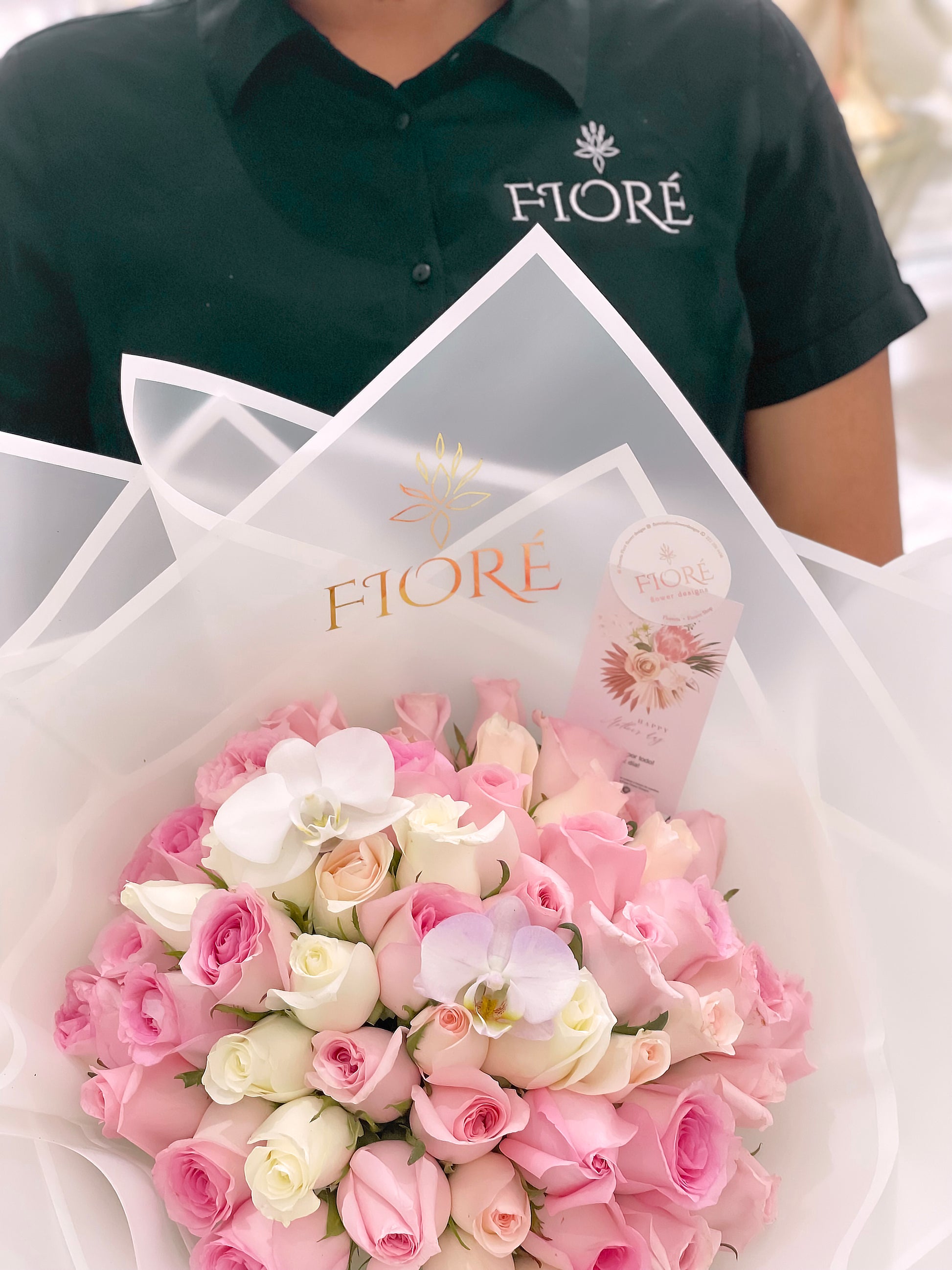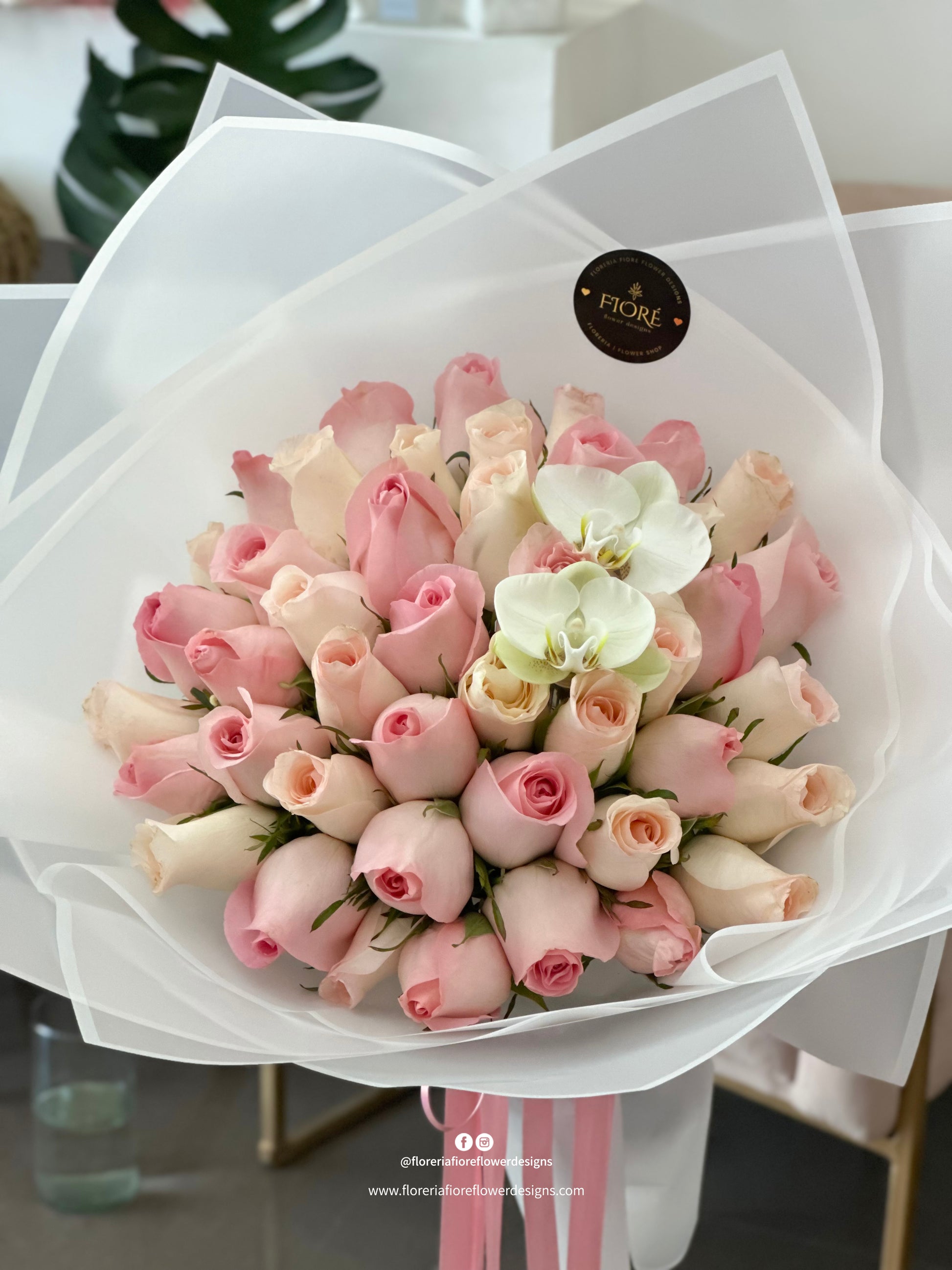 Bouquet diseñado con rosas mixtas en tonalidades pasteles, con dos hojas de orquídeas.