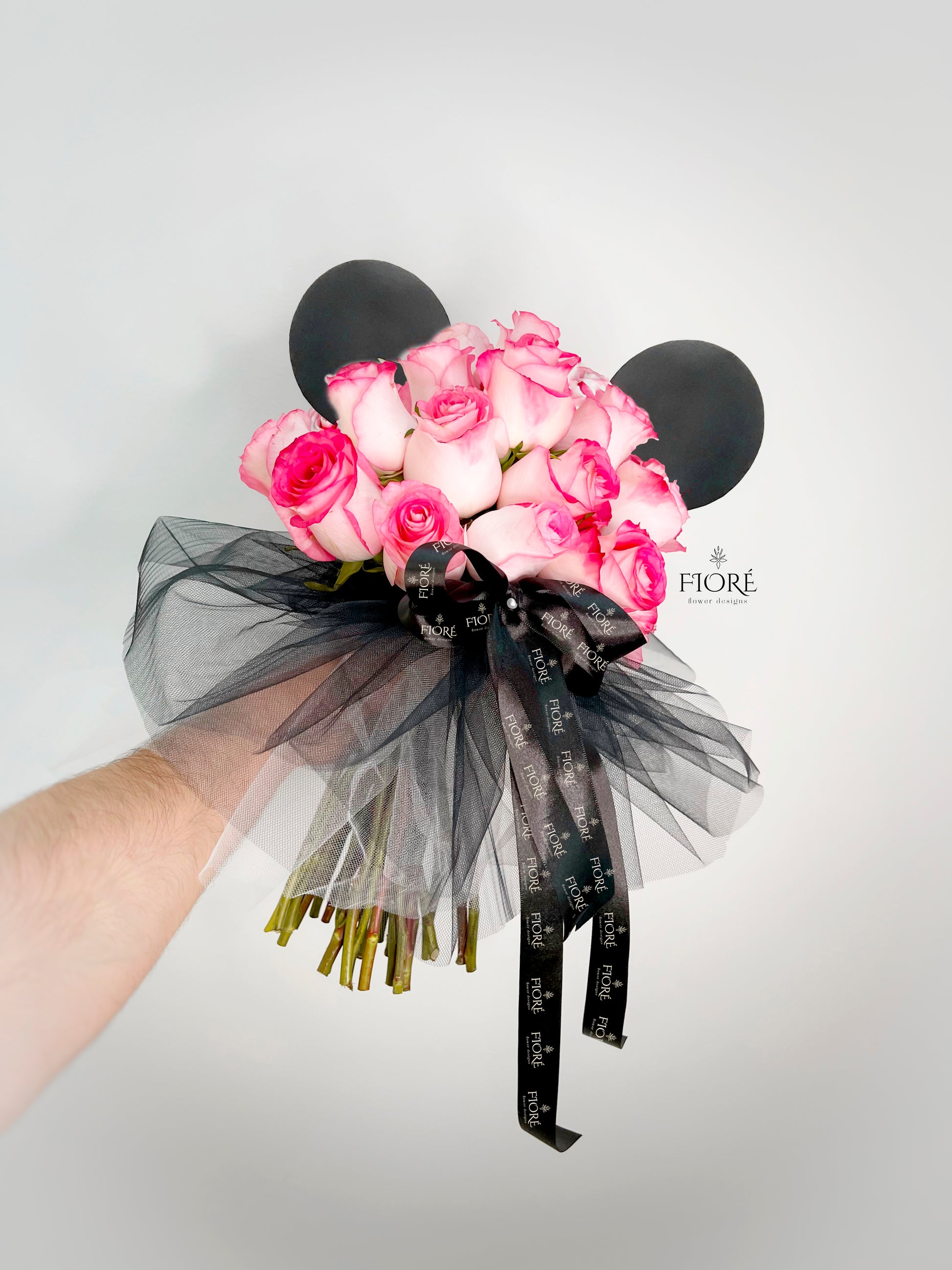 Bouquet diseñado con 24 rosas dándole un toque con orejitas y faldita de Minnie Mouse