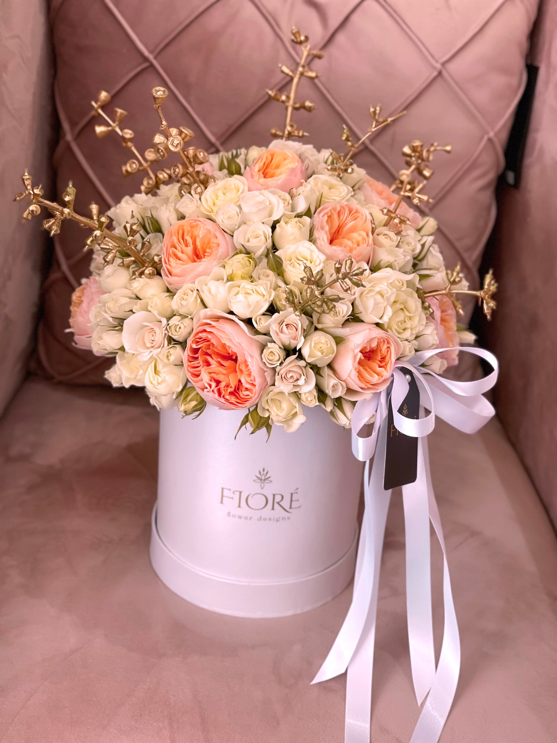 Box diseñada con rosas inglesas y rosas minis con un toque de dorado.