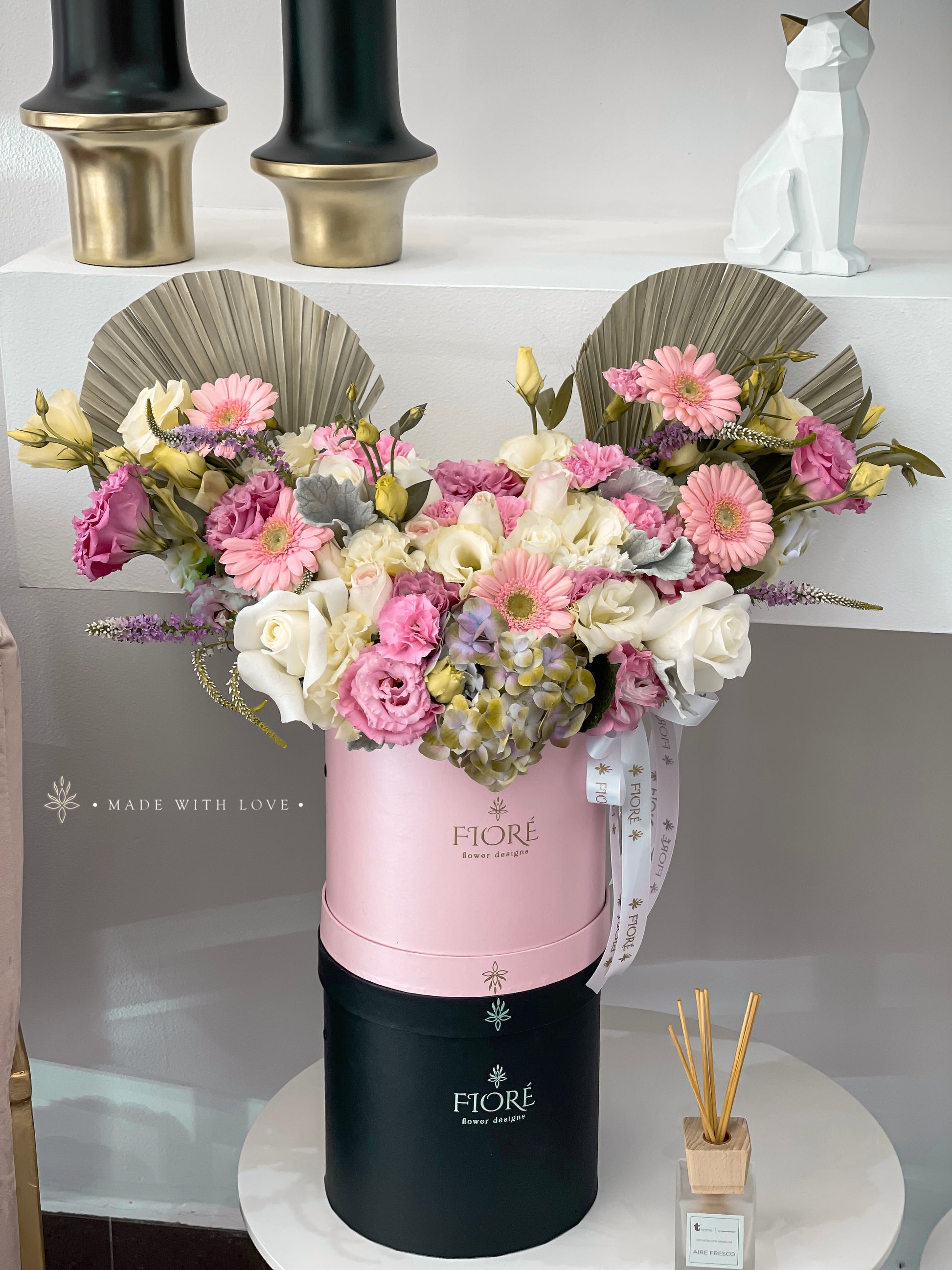 Box diseñada con una variedad de flores entre ellas rosas, lisianthus, hortensias, gerberas, entre otras más.
