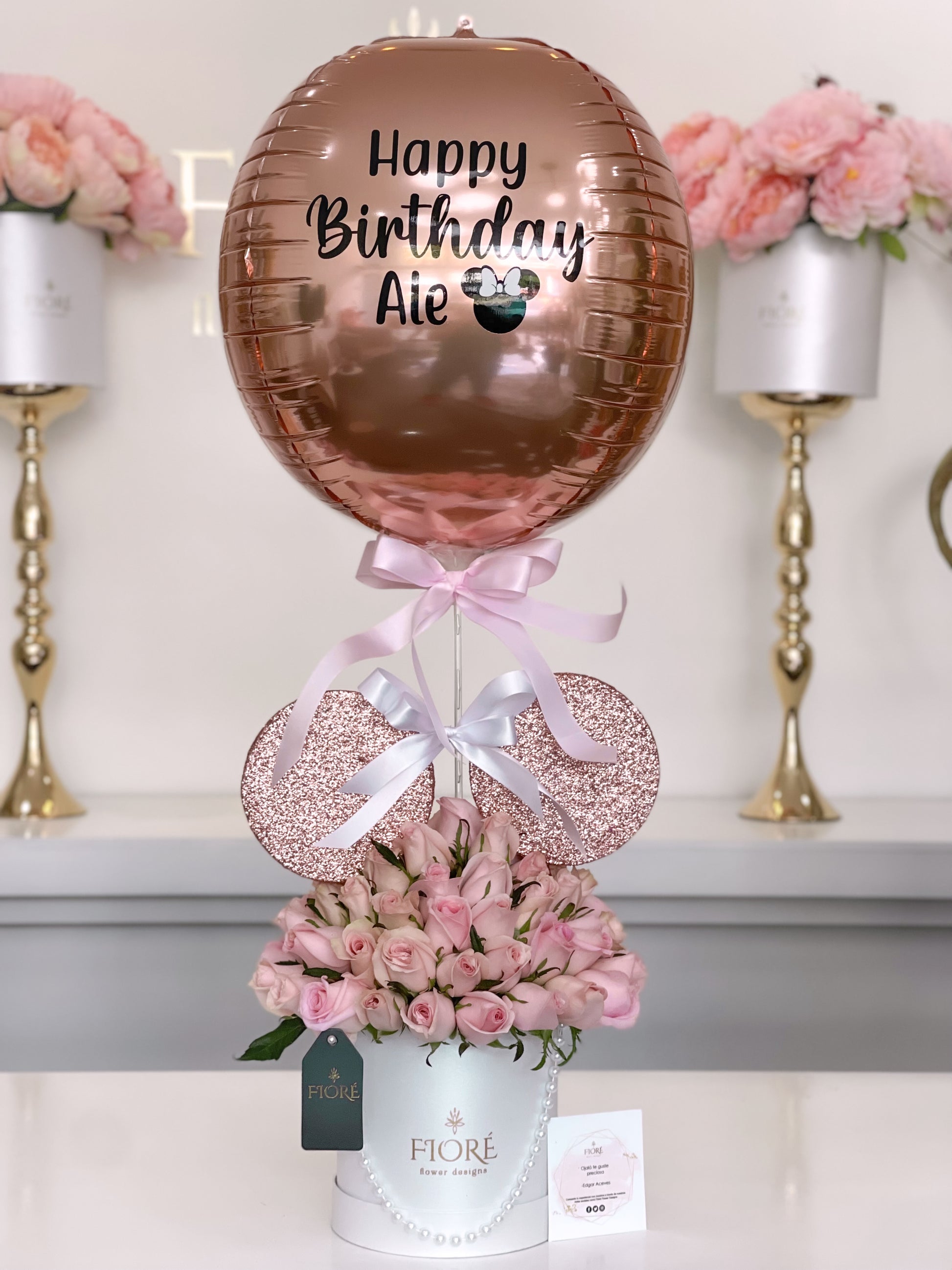 Box aperlada, diseñada con rosas color rosas y un globo color rosa gold con vinil personalizado.