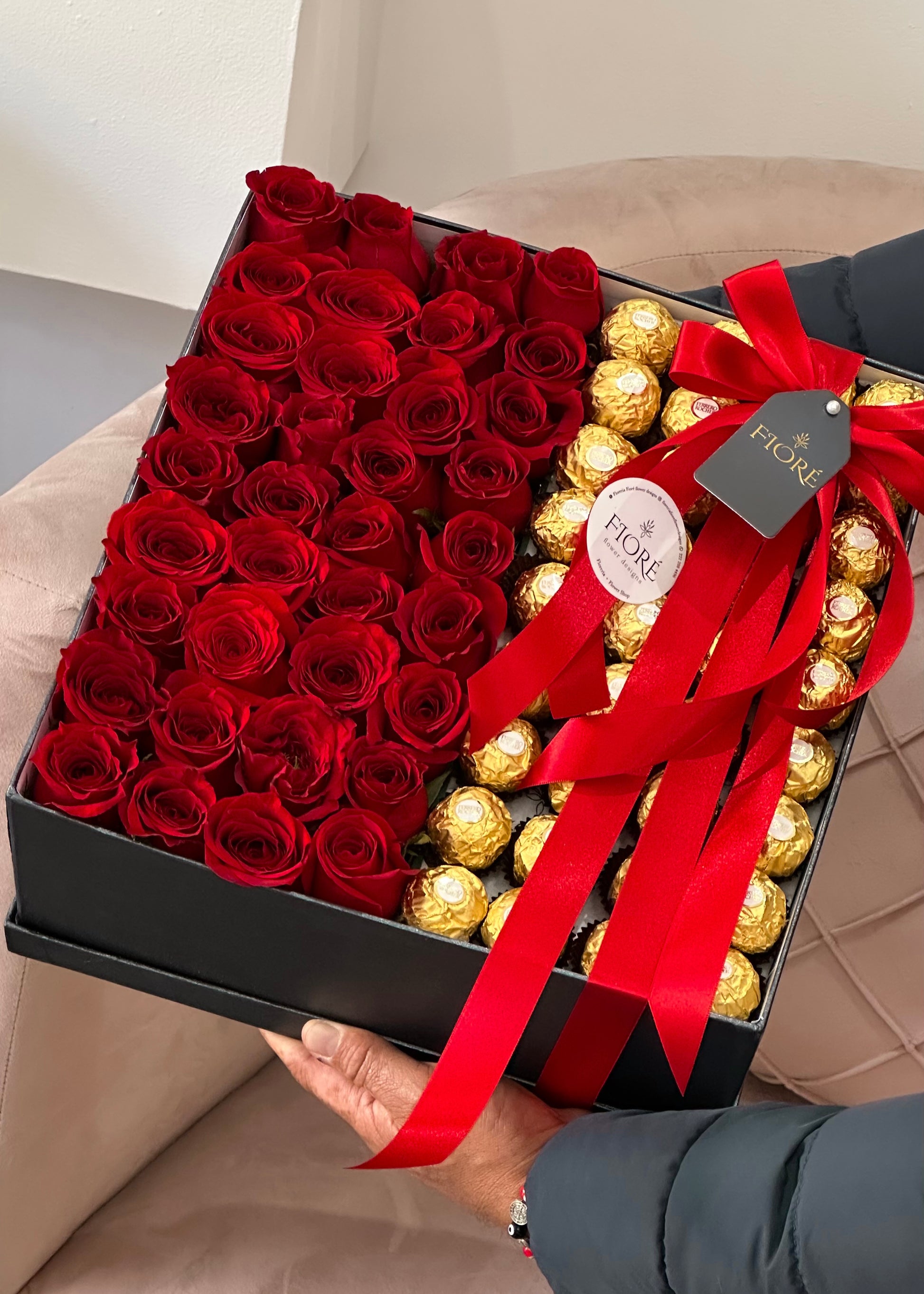 Box en forma cuadrada diseñada con rosas rojas y chocolates ferreros rochers.