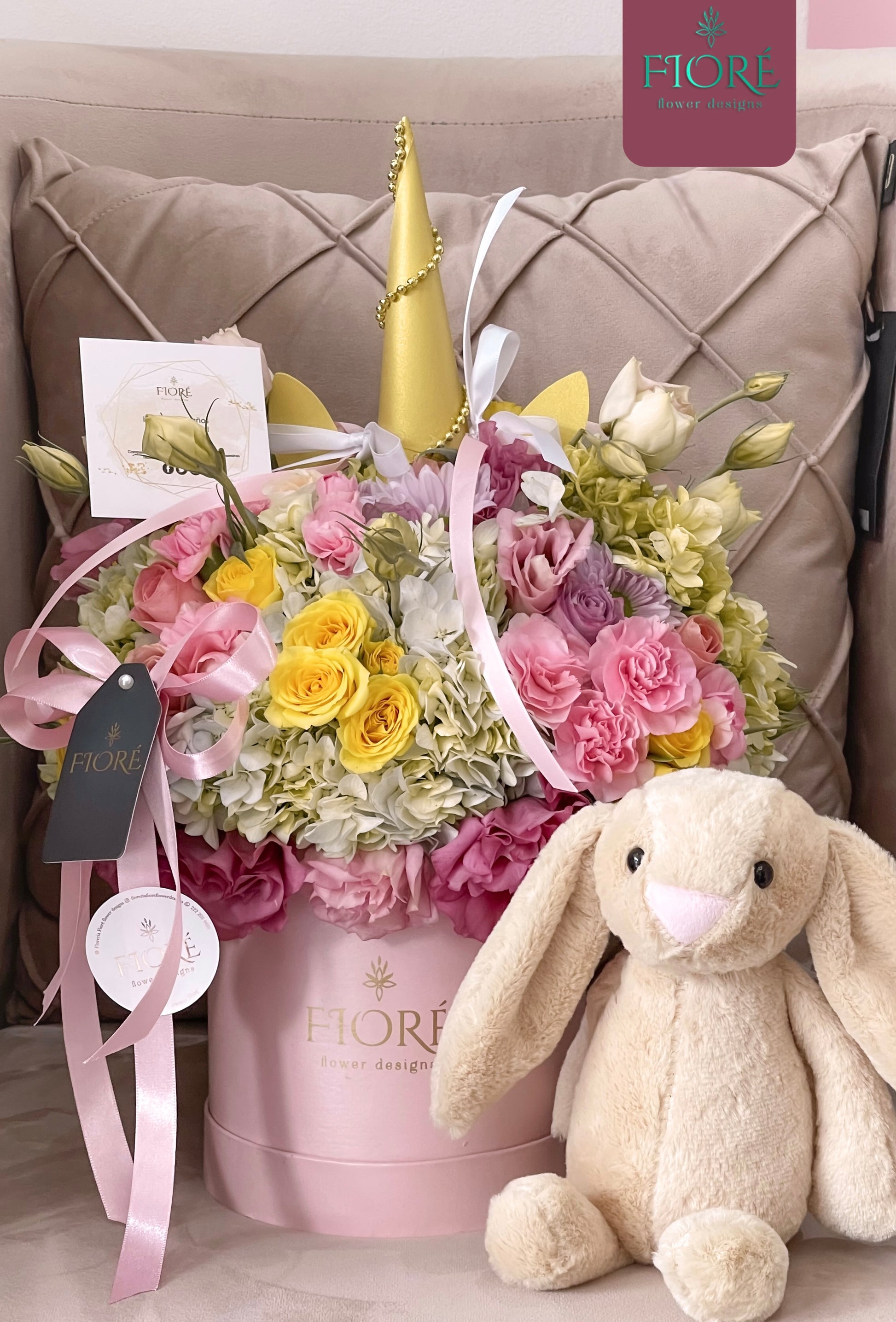 Box diseñada con flores mixtas entre ellas rosas, hortencias, lisianthus y otras más. Colocándose encima unas orejitas y cuerno de unicornio.
