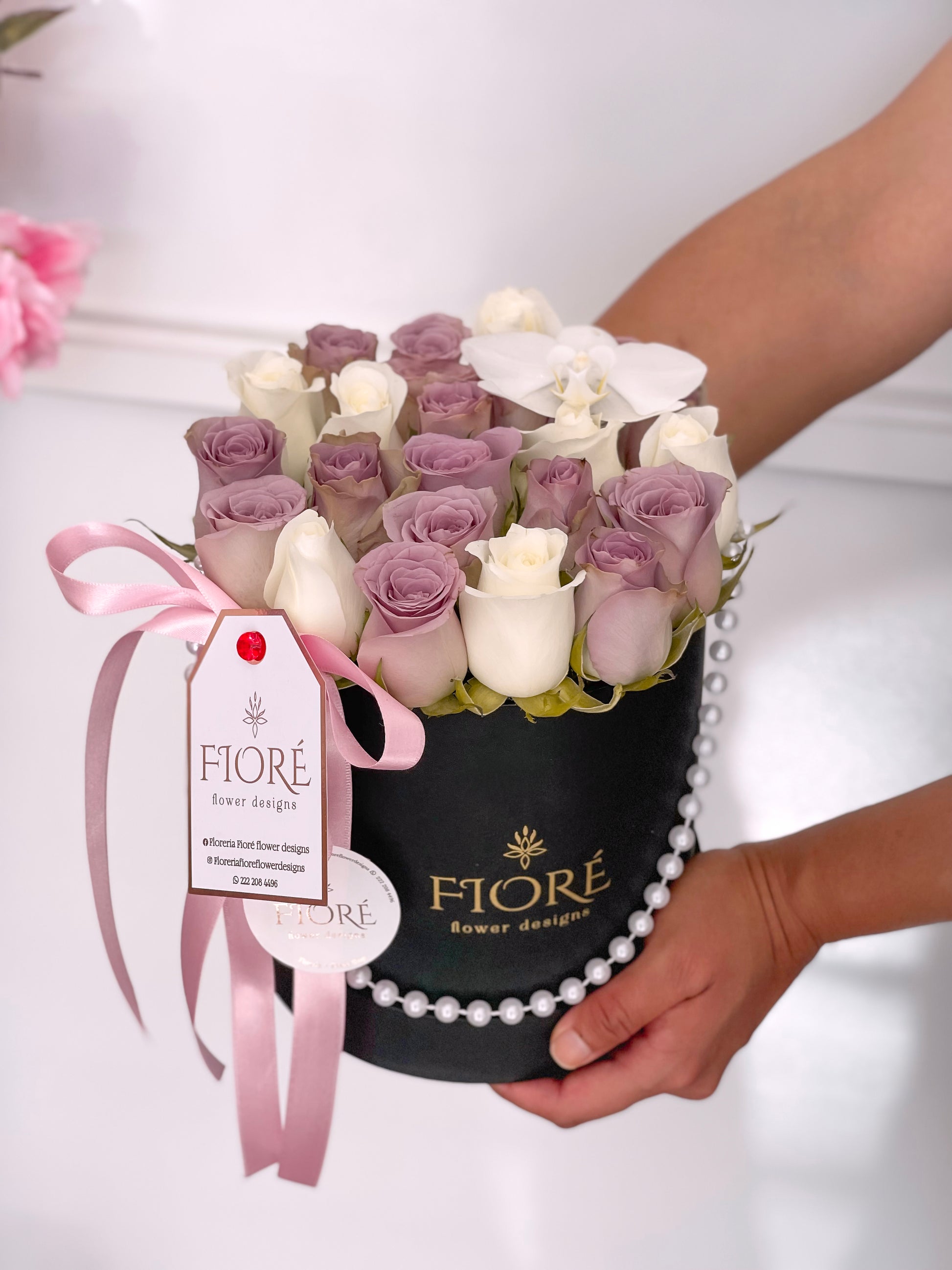 Box aperlada diseñada con variedad en tonos de rosas y una hoja de orquídea.