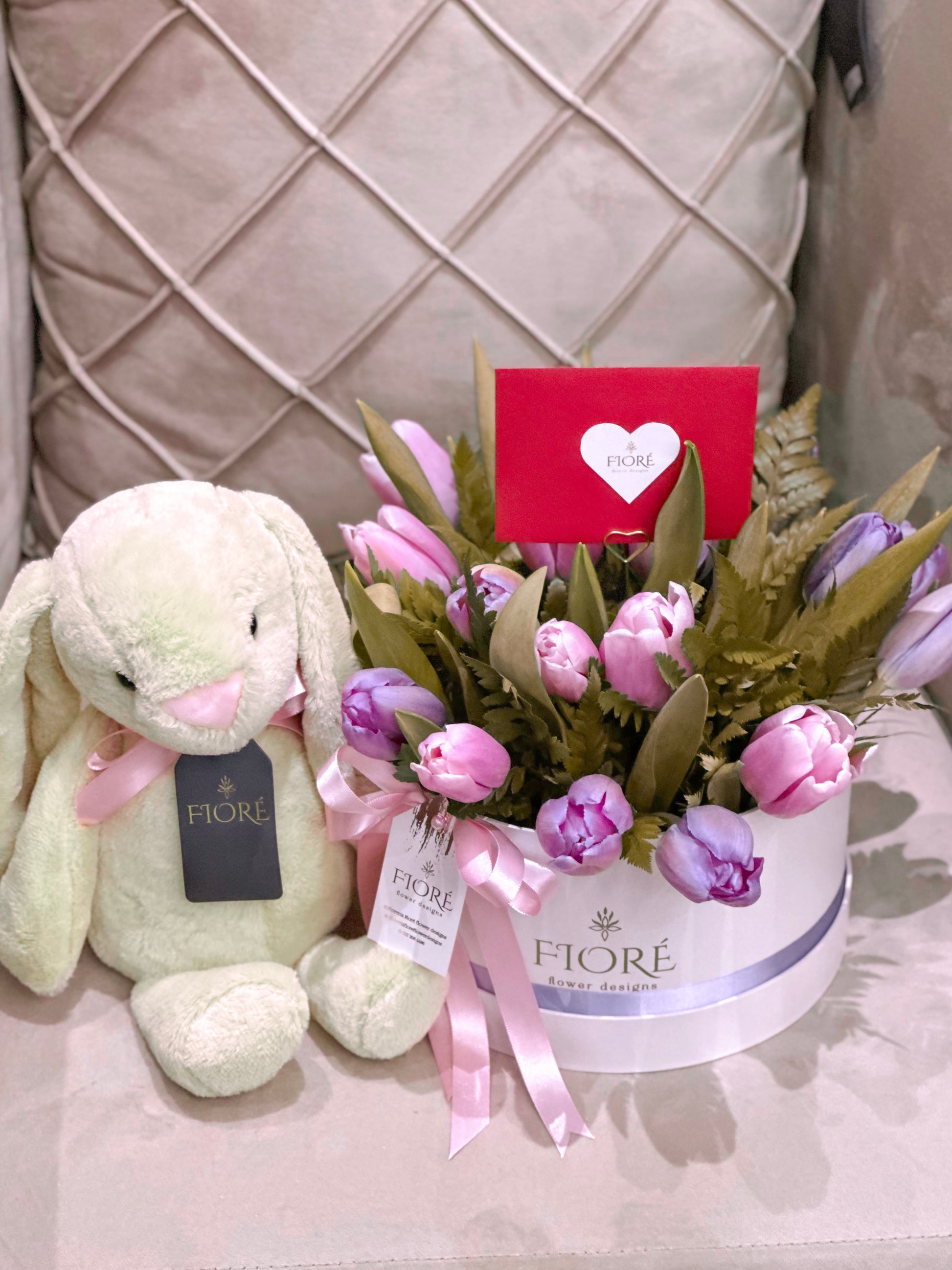 Box diseñada con 20 tulipanes con follaje mixto + Peluche conejito baby