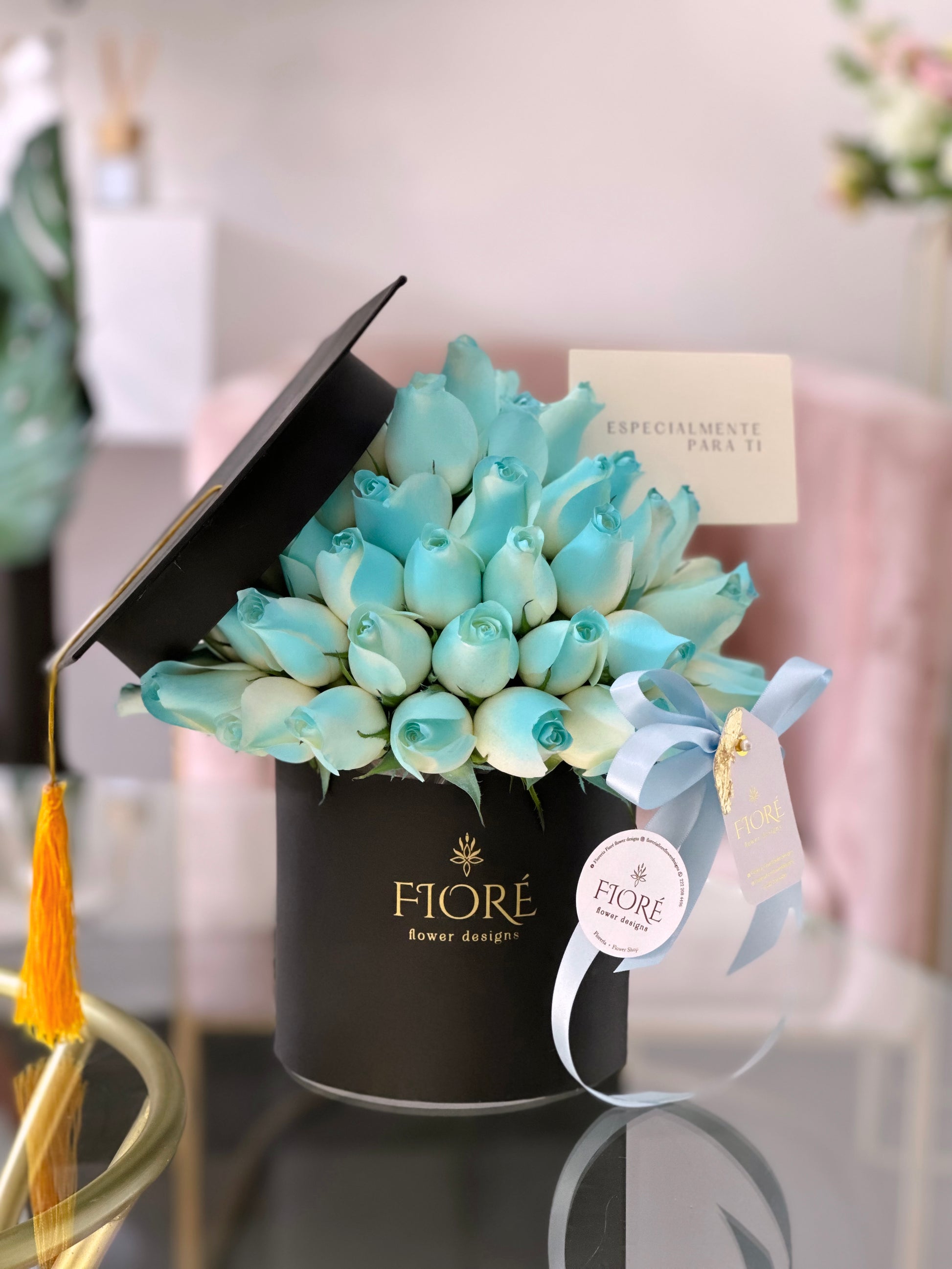 Box en forma de birrete diseñada con rosas color azul matizado (pintadas)