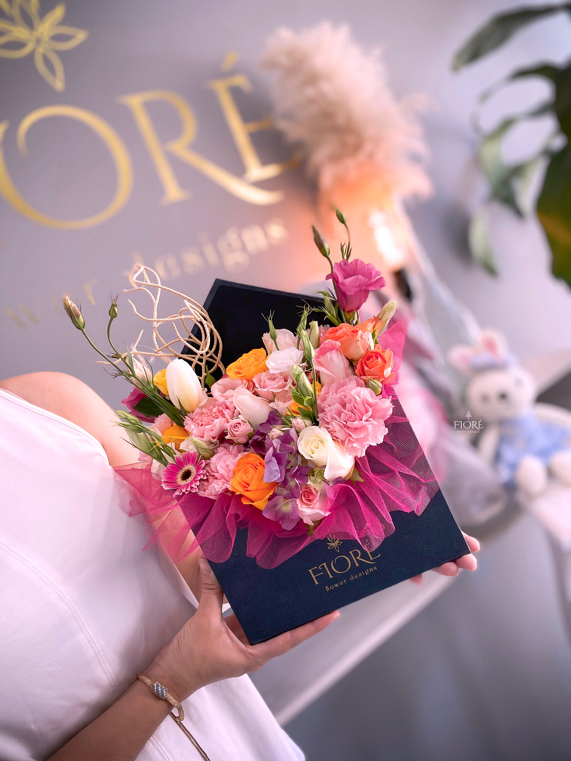 Box en forma sobre, diseñada con variedad de flores entre ellas rosas, minis gerberas, hortencias, entre otros.
