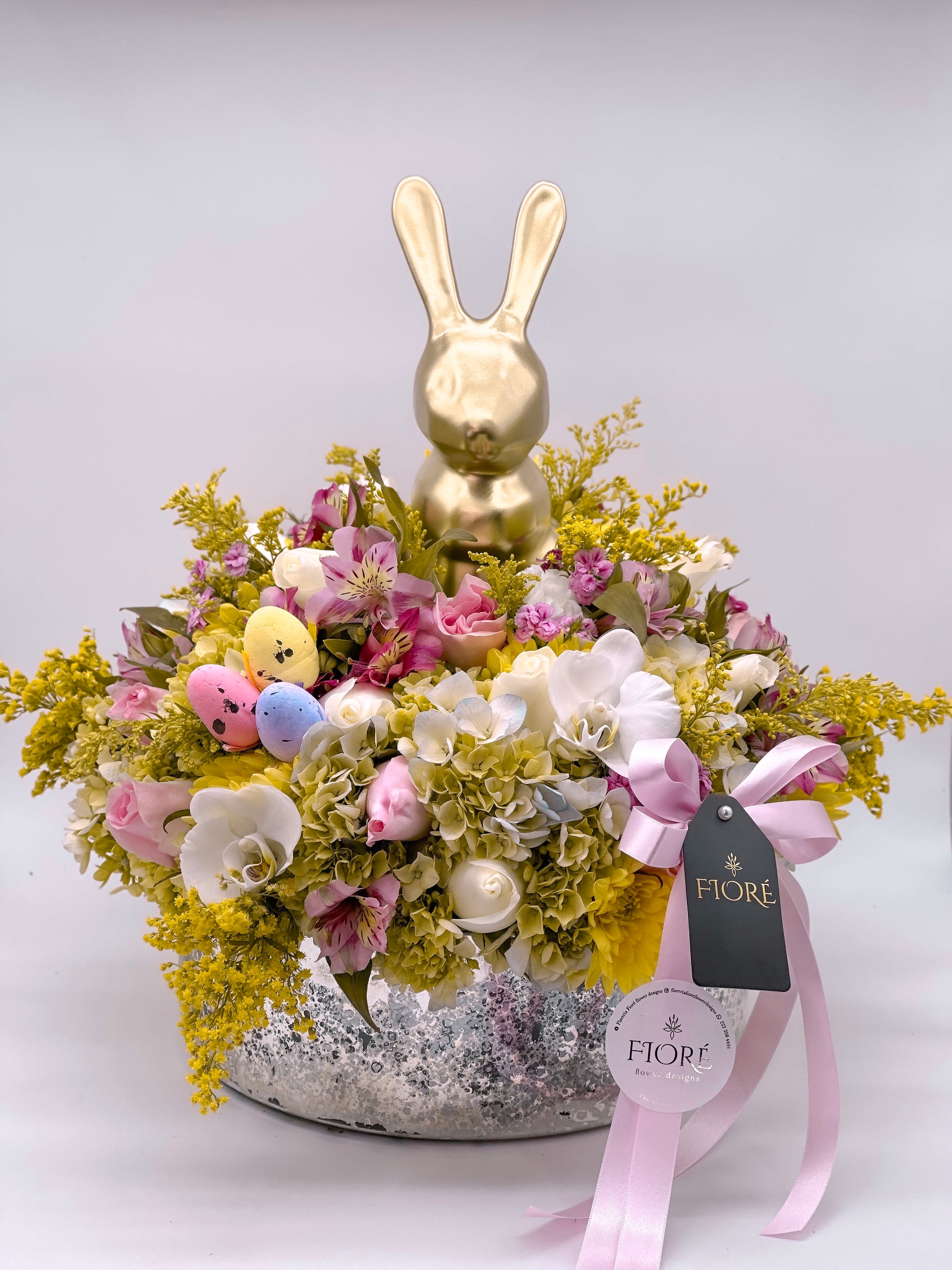 Celebra la Pascua con este precioso diseño de FFD lleno de hortensias, rosas, huevos de imitación, hojas de orquídeas en un exclusivo jarrón con forma de conejito.