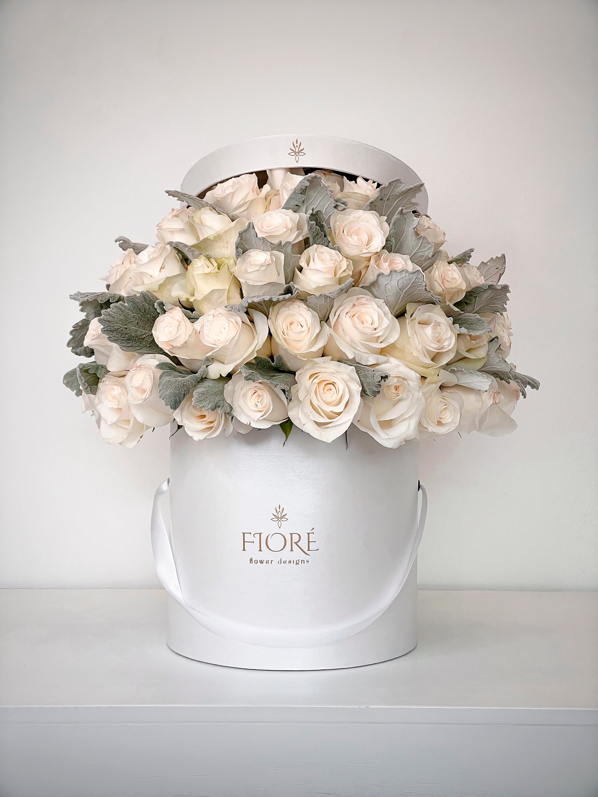 Box diseñado en forma de pastel con rosas blancas y millers.