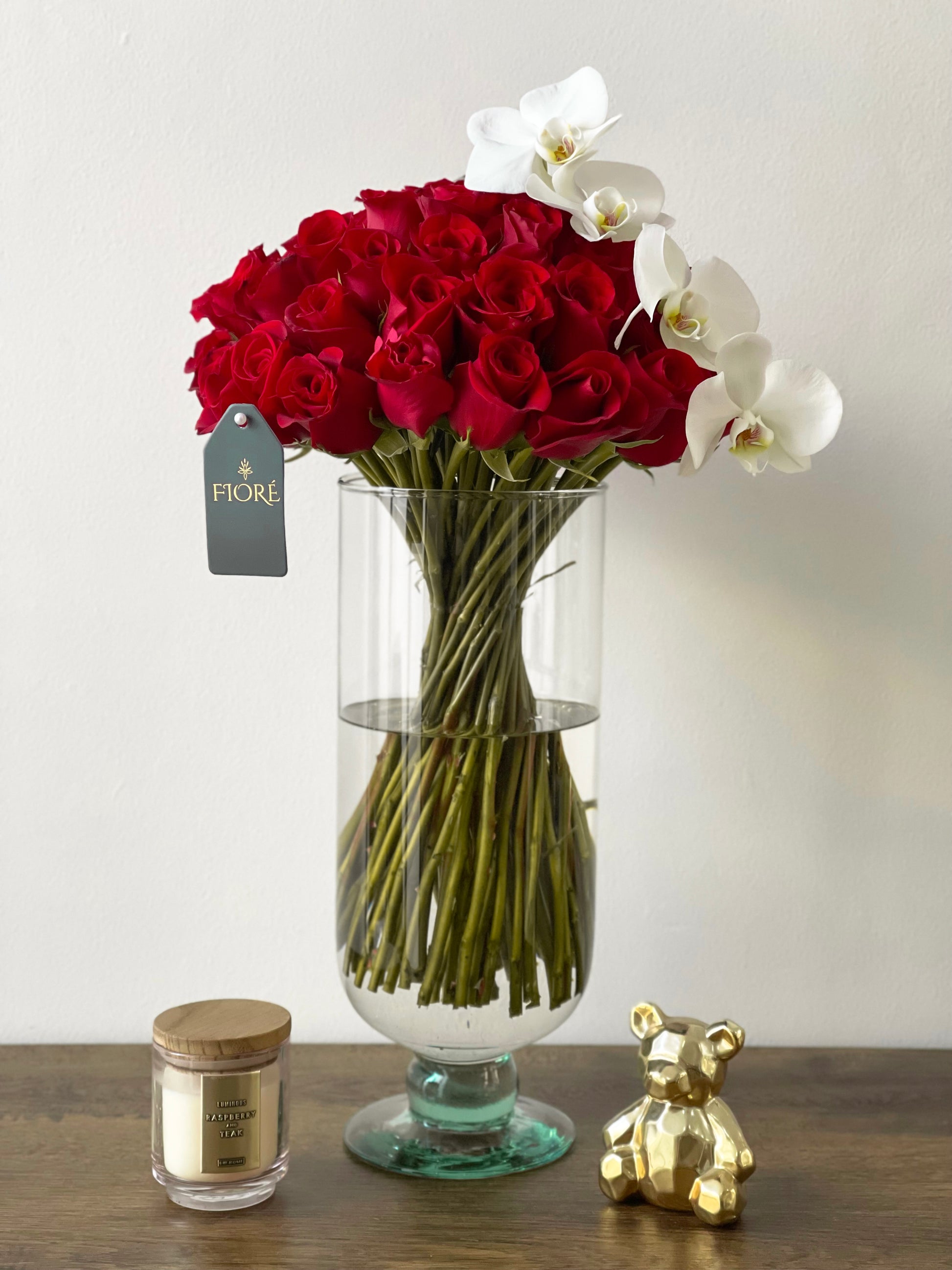 Base de cristal diseñada con 70-75 rosas rojas y una vara de orquideas