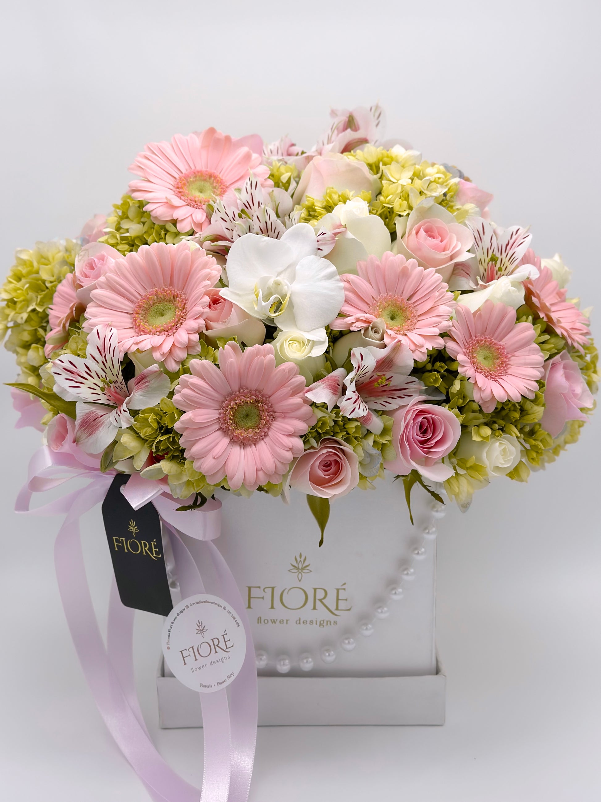 Box aperlada diseñada con rosas color rosas, hortensias dándole un toque especial con una hoja de orquídea.