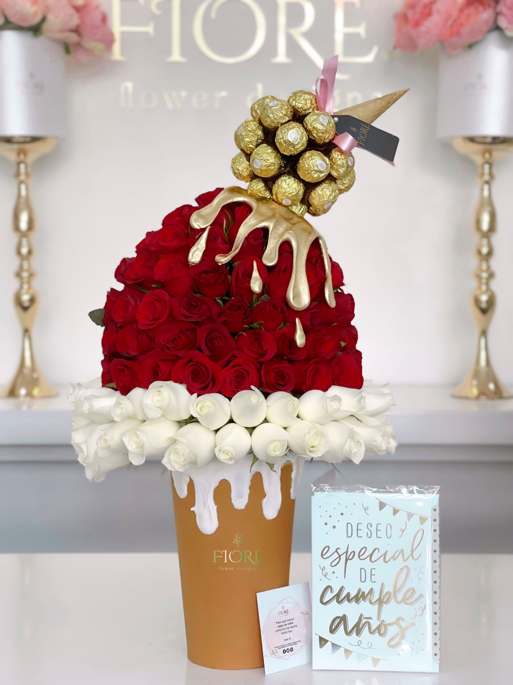 Caja en forma de cono, diseñada con dos bases de helado en rosas blancas y rojas. En la parte superior se coloca un ice cream mini de chocolates Ferreros rochers.