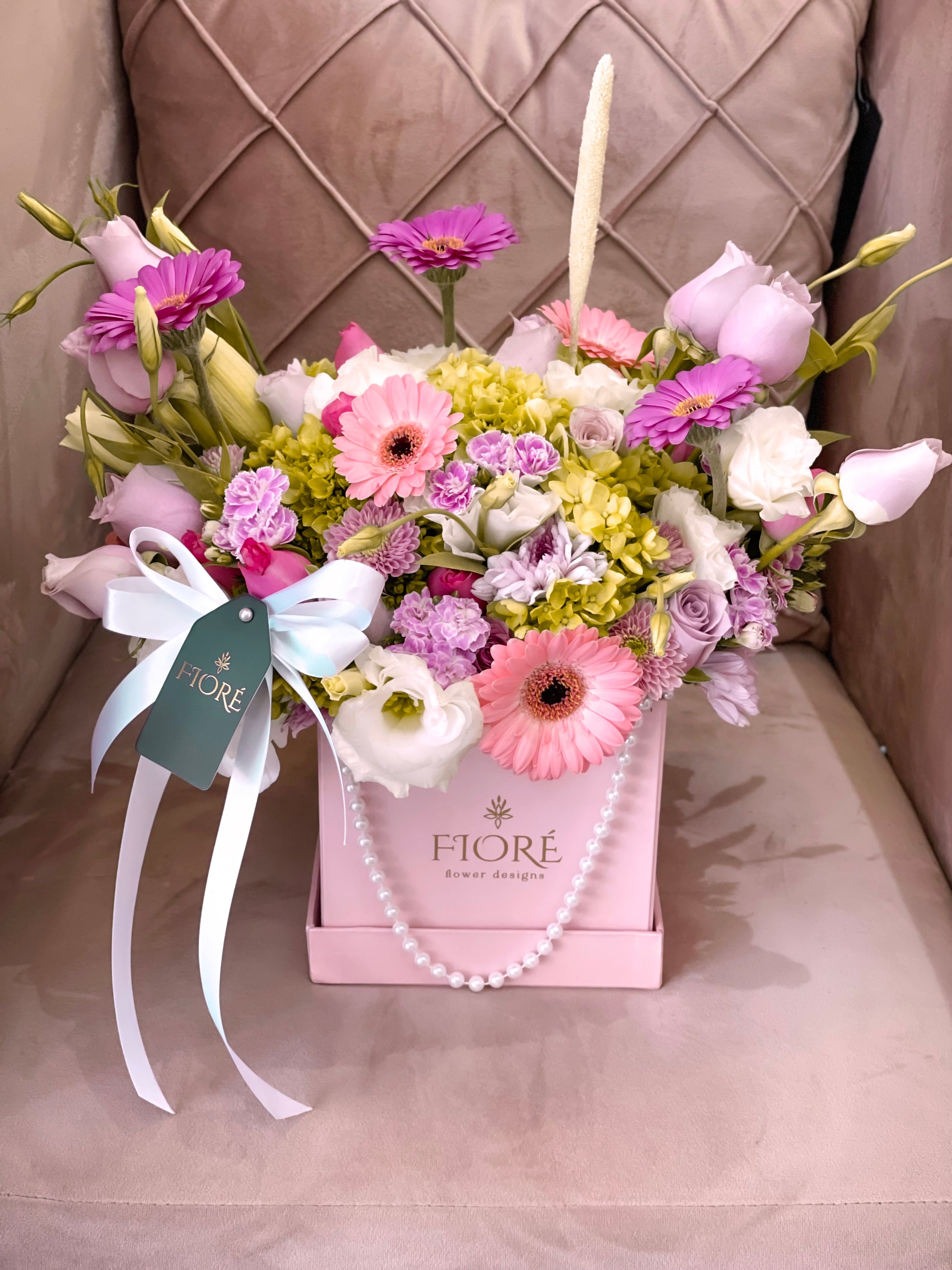 Box en forma cuadrada con perlas, diseñada con variedad de flores entre ellas rosas, gerberas, hortencias, entre otros.