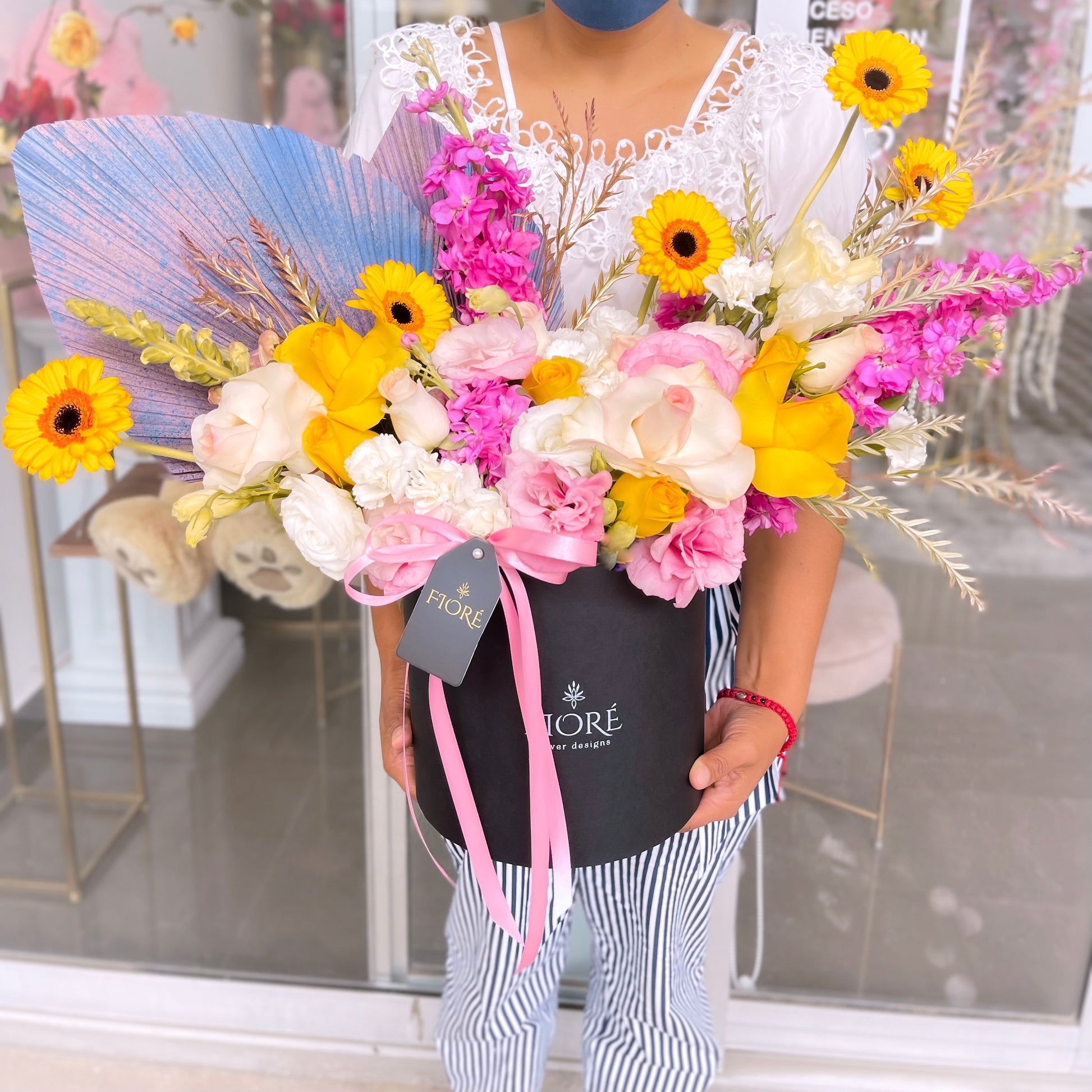 Box diseñada con una variedad de flores entre ellas rosas, lisianthus, gerberas, clavelina, snapdragon, entre otros, dándole así un toque fresco al diseño.
