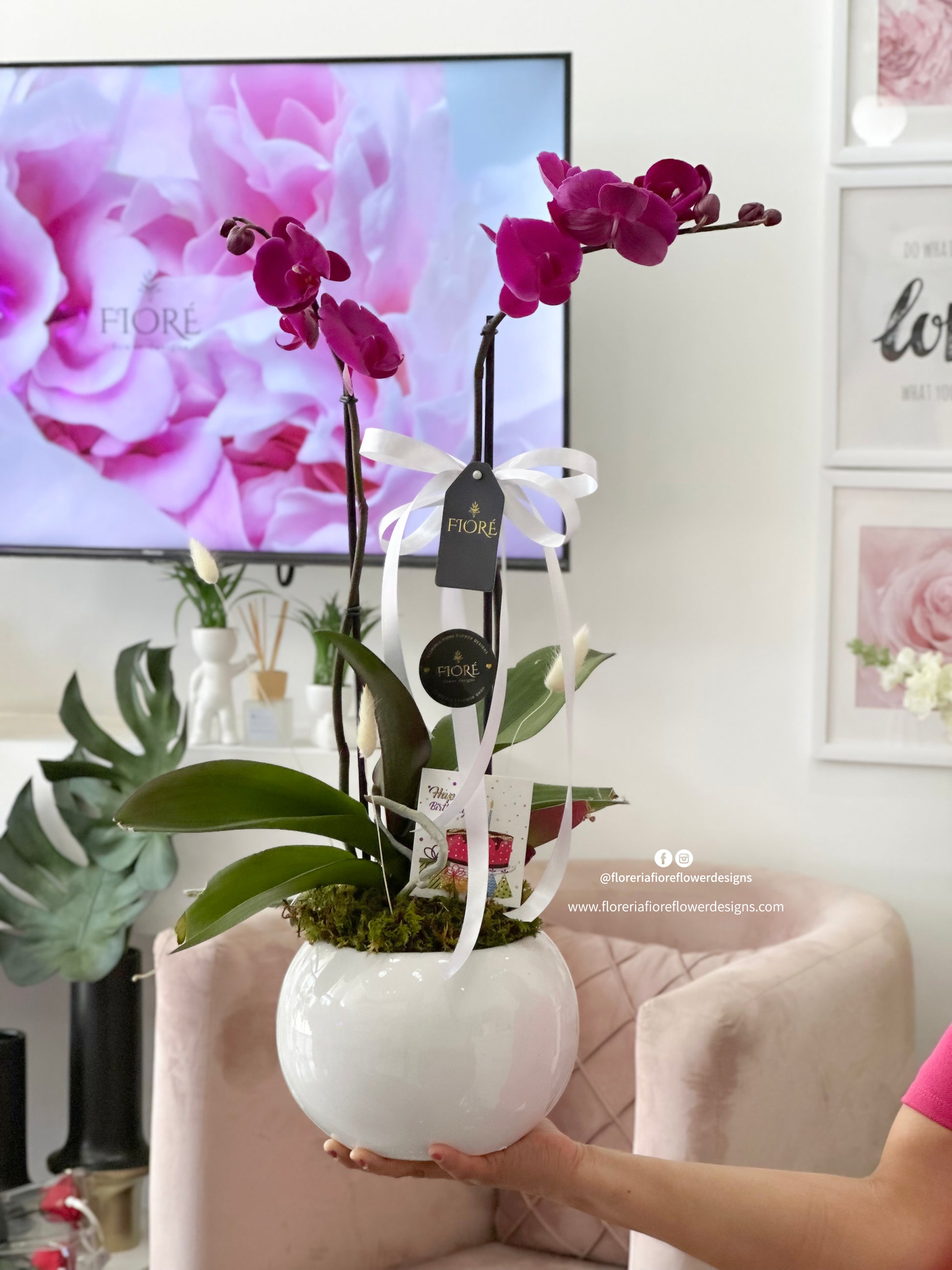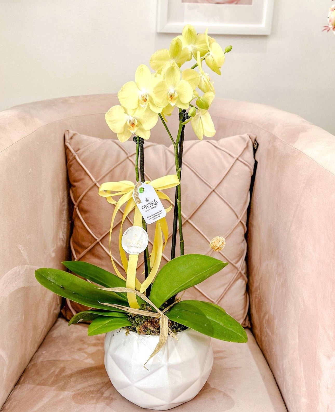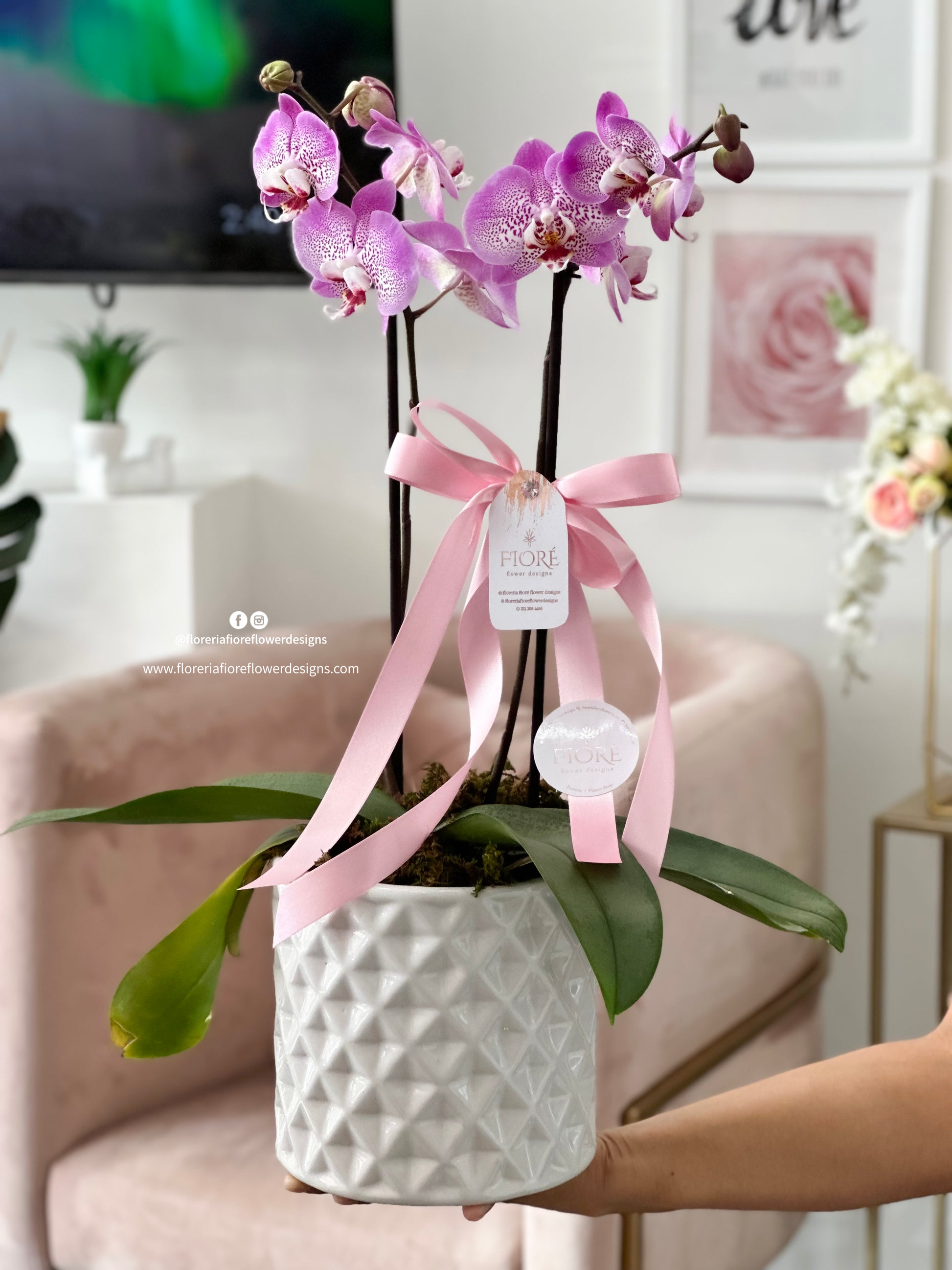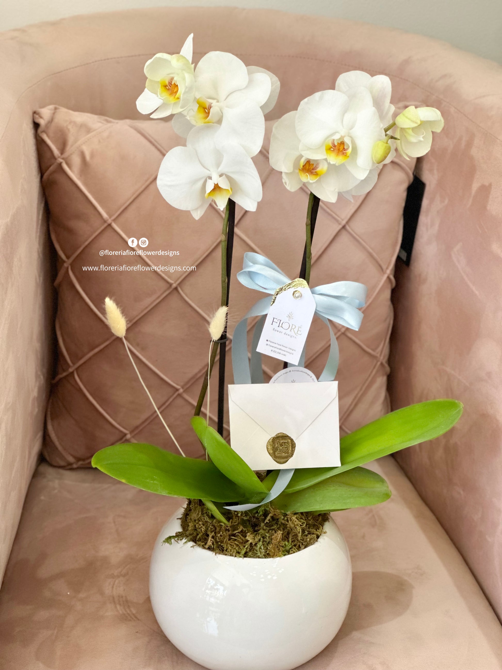 Base cerámica color blanca con una orquídea de 2 varas + follaje mixto.