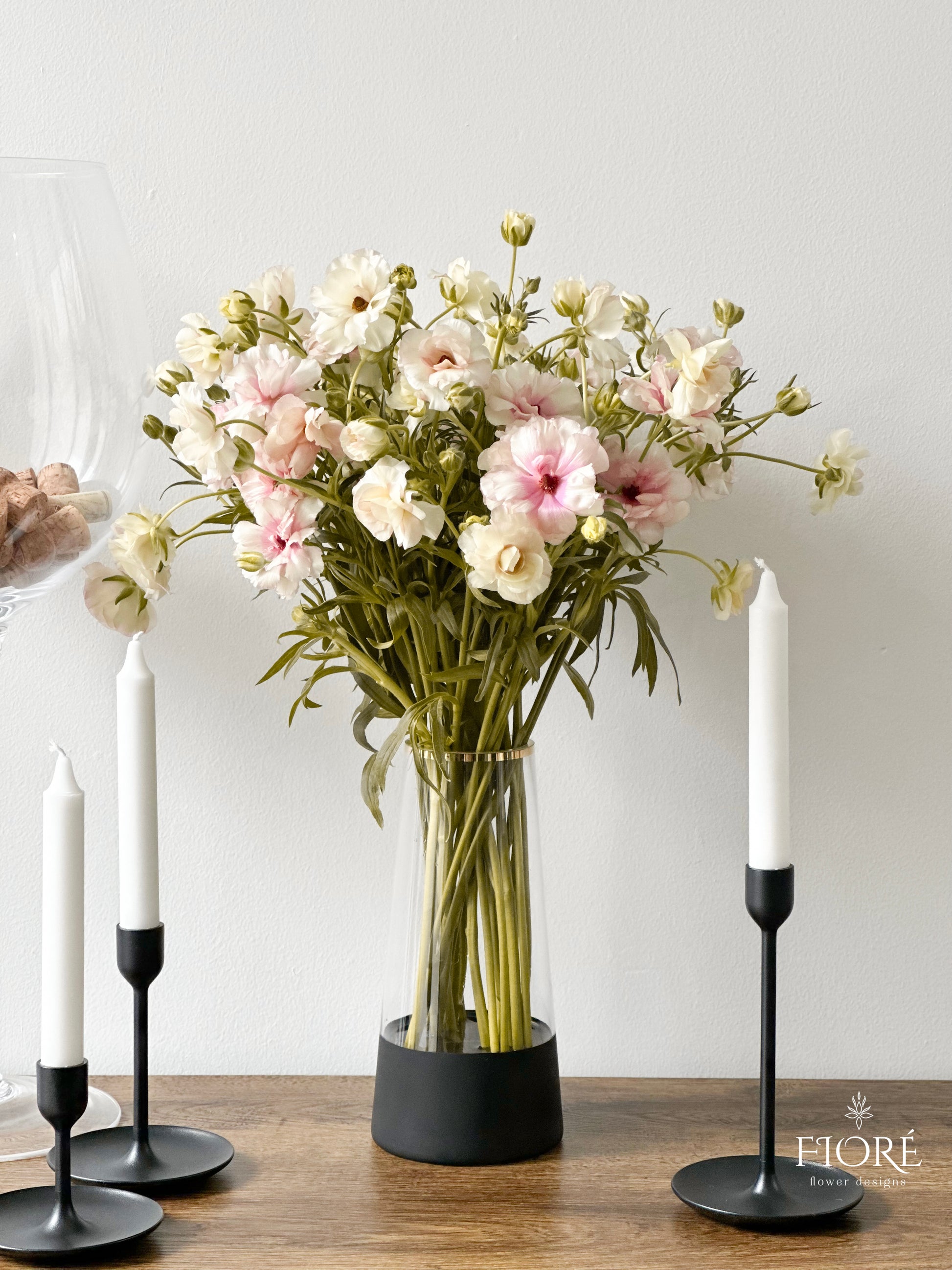 Base cristal con toque dorado y negro diseñado con flores de temporada ranúnculus mariposa, este arreglo es perfecto para colocar en casa u oficina.