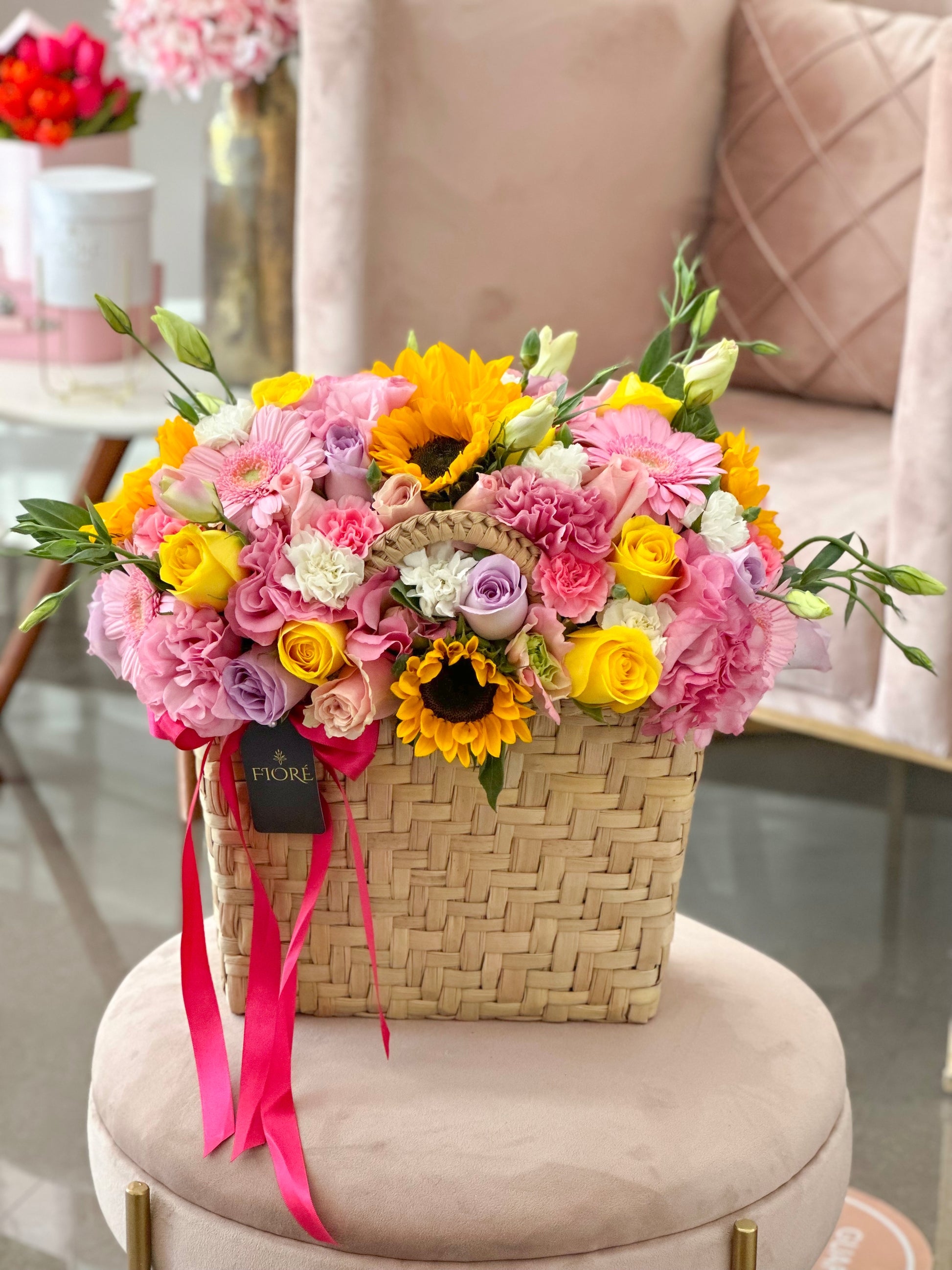 Bolsa de palma, diseñada con variedad en tonos de rosas, lisianthus, girasoles, clavellina y gerberas.