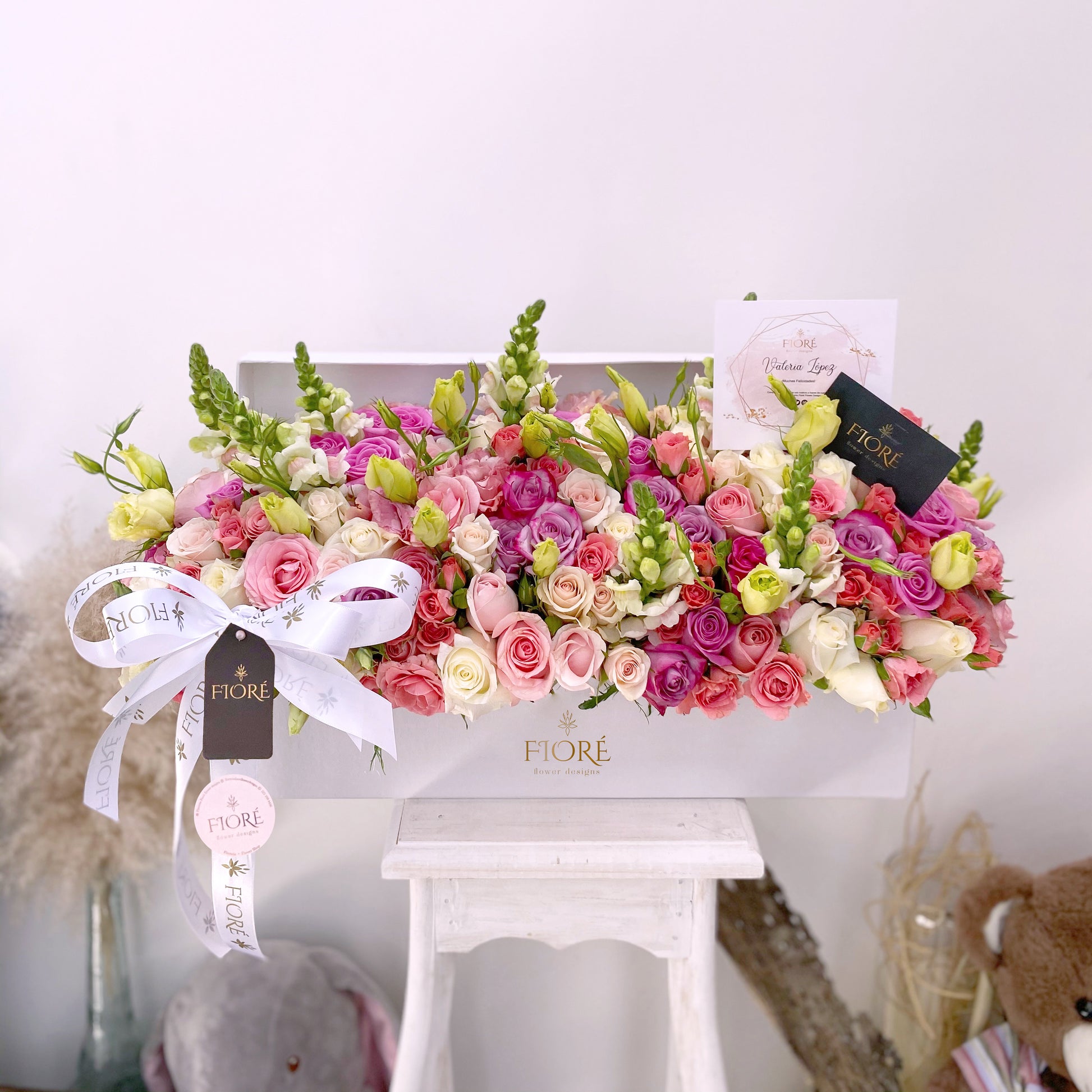 Box en forma rectangular diseñada con variedad de flores entre ellas rosas en diferentes tonalidades, lisianthus, boca de dragón, entre otros.